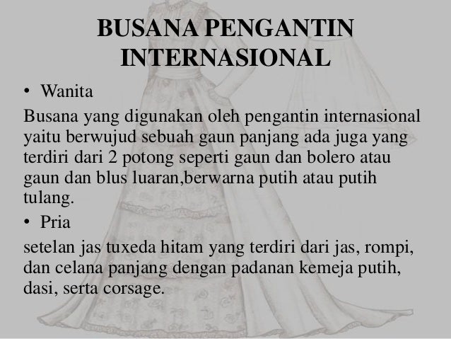 Tampil maksimal bagi pengantin pria tentu berbeda dengan pengantin wanita Bila pengantin wanita terlihat begitu cantik sebaiknya pengantin pria pun terlihat tampan dan tidak terkesan hanya sebagai pendamping Pilihan busana pun sebaiknya disesuaikan dengan tema pernikahan apakah tradisional internasional atau tradisional modifikasi 1